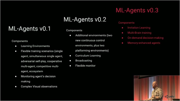 (セッション映像の切抜)以下はリリース済みの ML-Agents の機能一覧となります。半年くらいでこれくらい出してしまっており、すごいハイペースで開発を進めているようです。