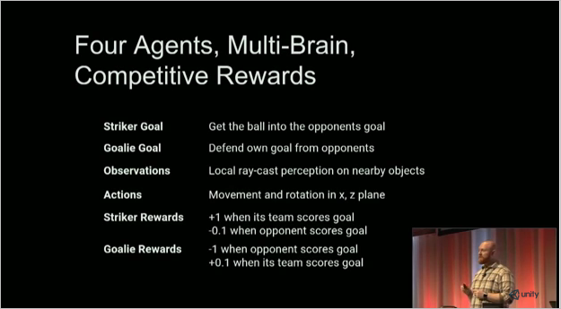 (セッション映像の切抜)マルチブレインの例となります。学習の方法としては、まずストライカーだけを学習させたそうです。