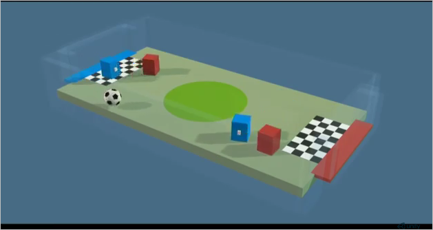 面白いことに、学習が進むにつれて、コードなどで指示はしてないが、ストライカーはゴールを決めやすい敵ゴール前あたりに陣取り始め、キーパーは自分のゴール前でストライカーからのゴールをブロックしやすい場所に動き始めるとのこと。