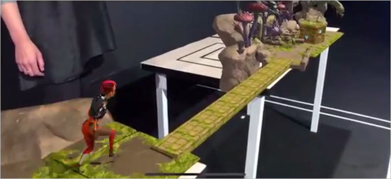 そして、最終的には机の上にできたゲームシーンでゲームキャラクタが走って敵を倒す ARシーンがデモされました。