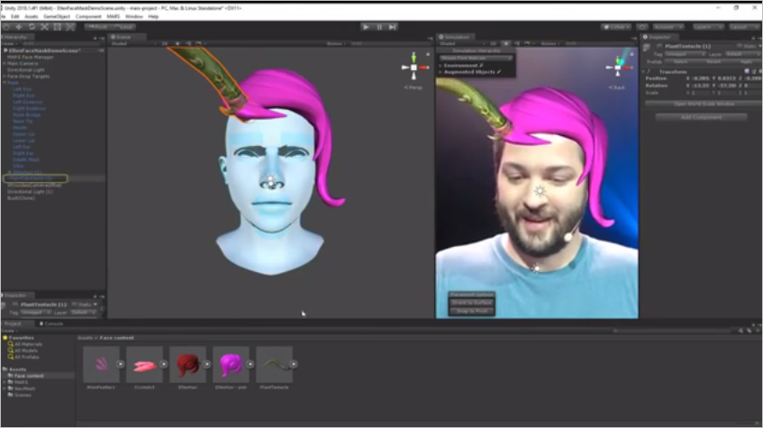 Unityエディタ上で3Dモデルの顔に 3Dオブジェクトを貼り付けていきます。