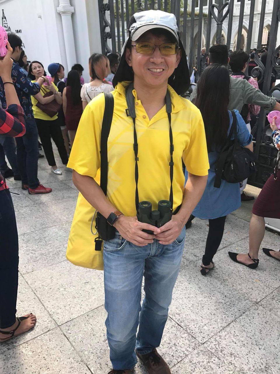 黄色の服が彼です。この目立つ服装は彼のアイデア勝ちですね。事前にこの写真を見せてもらっていたので、劇場ではっきり彼を認識できました。エキストラとして出る際は、こんな技を使うと一瞬の映像でも認識できますね。