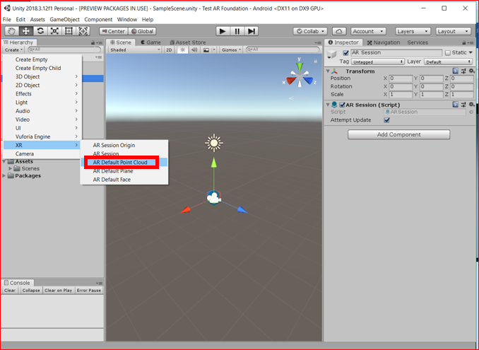 また、Hierarchyビューから Create > XR > AR Session をクリックして、AR Session オブジェクトを作成します。
