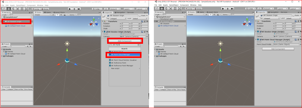 Hierarchyビュー上の「AR Session Origin」をクリックして、Inspectorビュー上で Add Component ボタンをクリックします。そこから、「AR Point Cloud Manager」を検索して追加します。