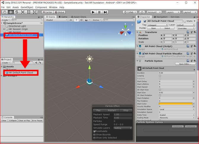 Hierarchyビュー上の「AR Default Point Cloud」をProjectビューにドラッグ&ドロップして、Prefab化します。