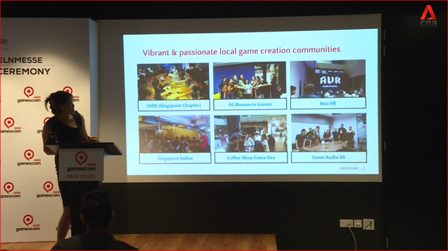 上の写真は友達で Singapore Games Guild(シンガポールのゲーム開発者コミュニティ)のリーダー Gwen Guo さんの発表。シンガポール内のゲーム関連コミュニティ、団体も全面協力していきます と言う話。
