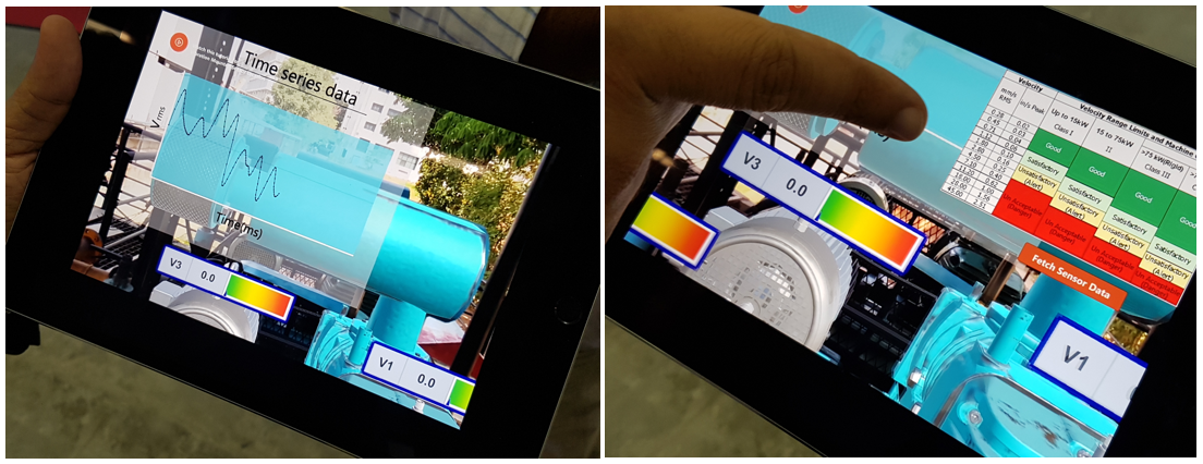 現場で機械の形を認識すると、センサーの情報や整備方法が機械の適した位置に表示されるARです。