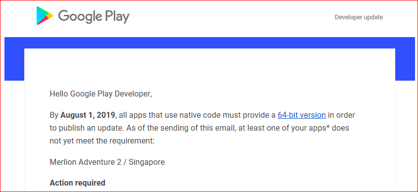 最近アプリを 64ビット対応して、Google Play に再アップロードしようとしたら、以下のような警告がでました。