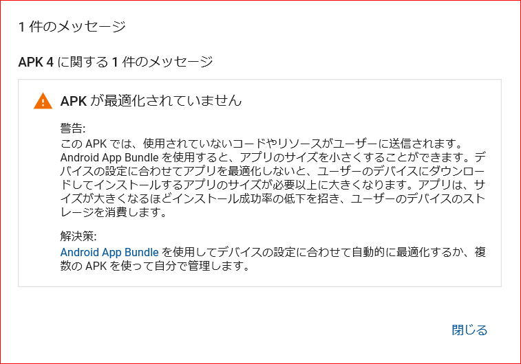 「APKが最適化されていません」とのこと。