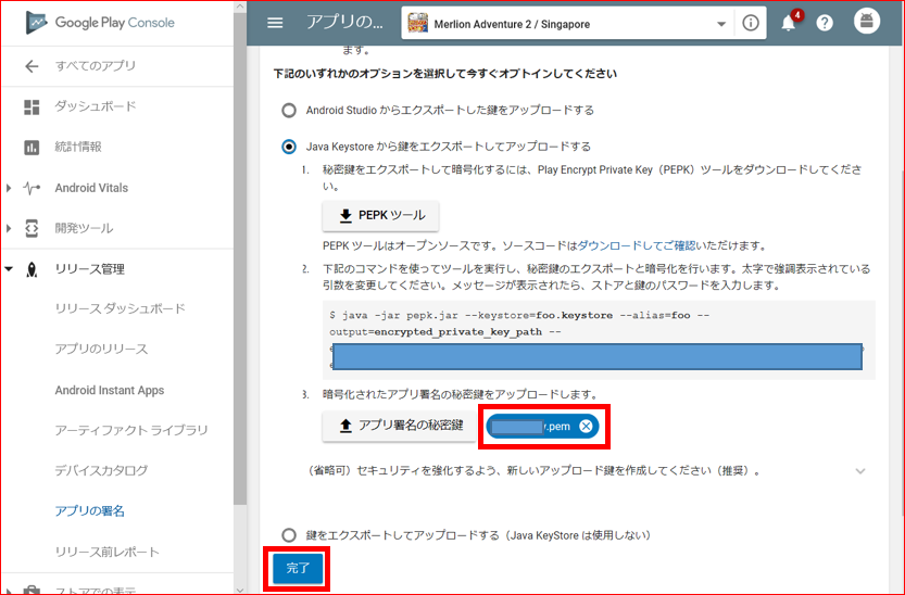 秘密鍵のアップロードが終了すると、「アプリ署名の秘密鍵」ボタンの隣に 今アップロードした pemファイル名が表示され、下の「完了」ボタンが Active になります。