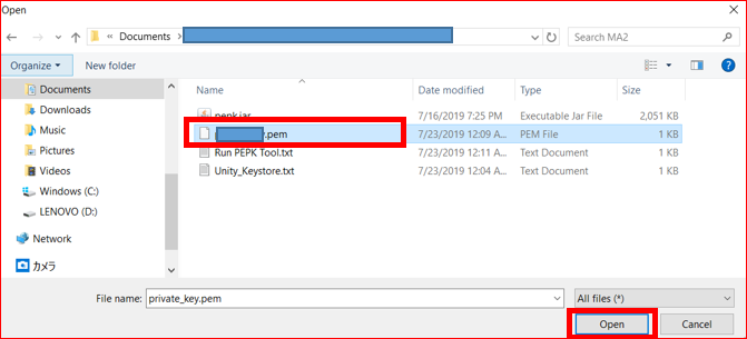 ファイルの選択ウィンドが開くので、先ほど作成した pemファイルを選択します。そして、「Open」ボタンをクリック。