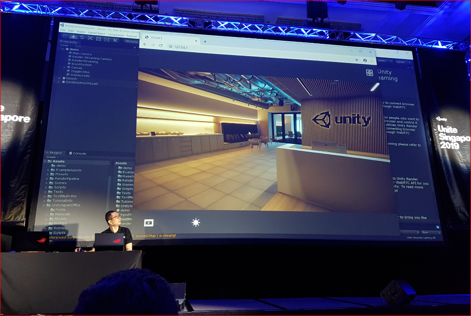 次は Unity Singapore の Evangelist である Boon Yi Fei が登壇。(Unite Tokyoでは 松本一輝 さんのパート。)ここでは Unity Japan の活動として Web RTC を活用して、Unityとブラウザをリアルタイムに連携させる Unity Render Streaming を紹介。