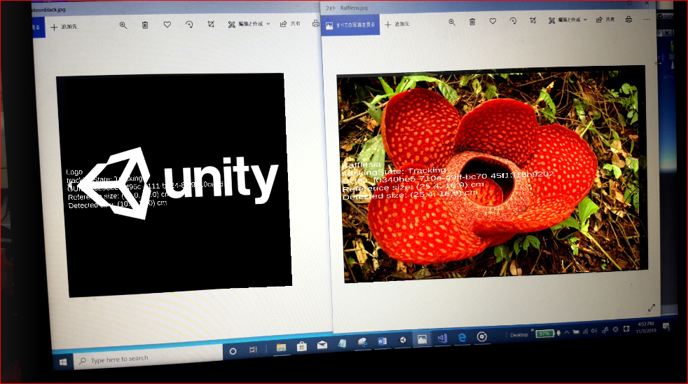 マーカーを認識すると、それに大きさや向きを合わせて同じ画像を表示させます。トラッキングをしているので、向きを変えてもきれいに重ねて表示してます。