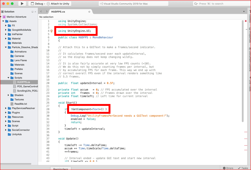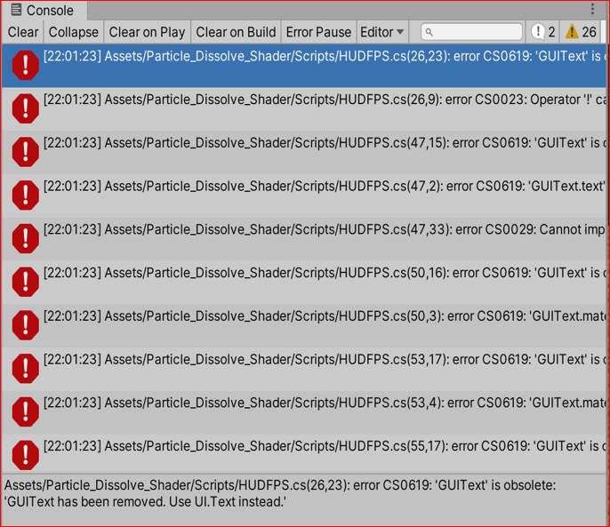 Assets/Particle_Dissolve_Shader/Scripts/HUDFPS.cs(26,23): error CS0619: 'GUIText' is obsolete: 'GUIText has been removed. Use UI.Text instead.'