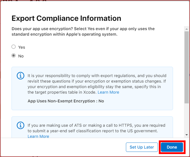 輸出コンプライアンスで、アプリ内で暗号化を使っているかを回答します。