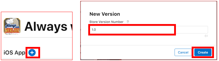先ほど作成したアプリから New Versionを作成します。メニューの iOS Appの右側にある「+」ボタンをクリックしてVersion Numberを入力し、「Create」をクリック。