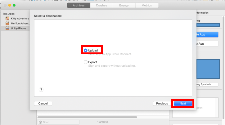 次は、引き続き Xcodeにてアプリのアップロードを行います。同じ Archivesの画面右側にある「Distribute App」をクリックします。