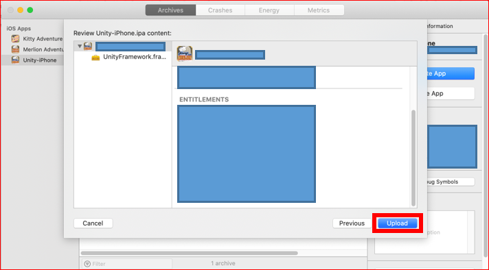 アプリの情報が表示されるので確認して、「Upload」をクリックします。