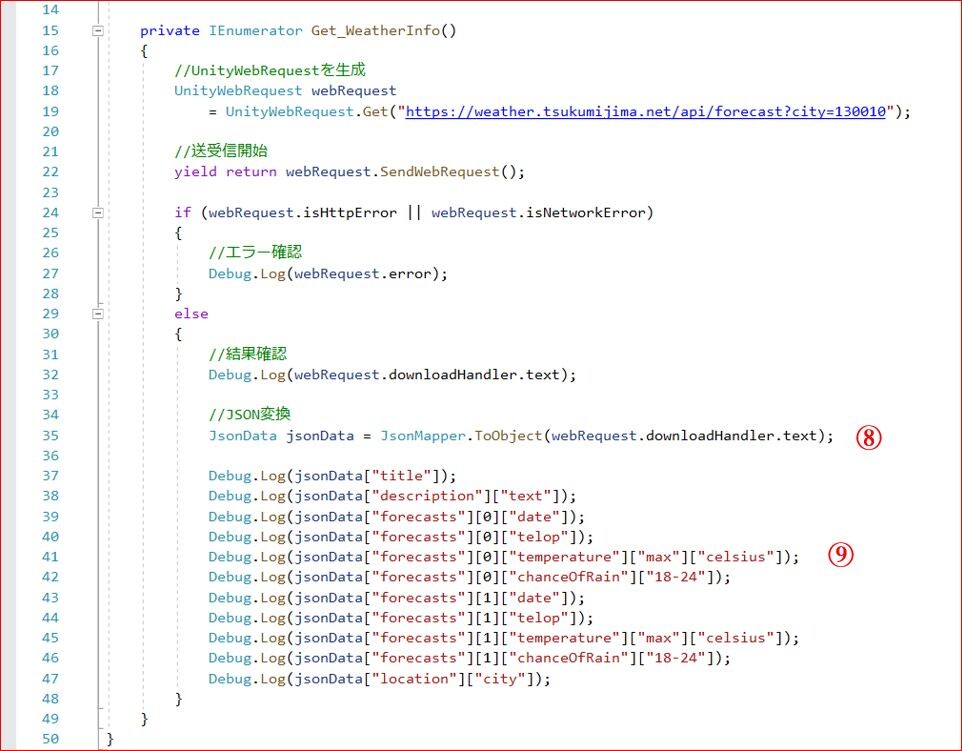 ⑨ :プログラムで利用できる形に分解した天気情報を Debug.Logで表示してみます。