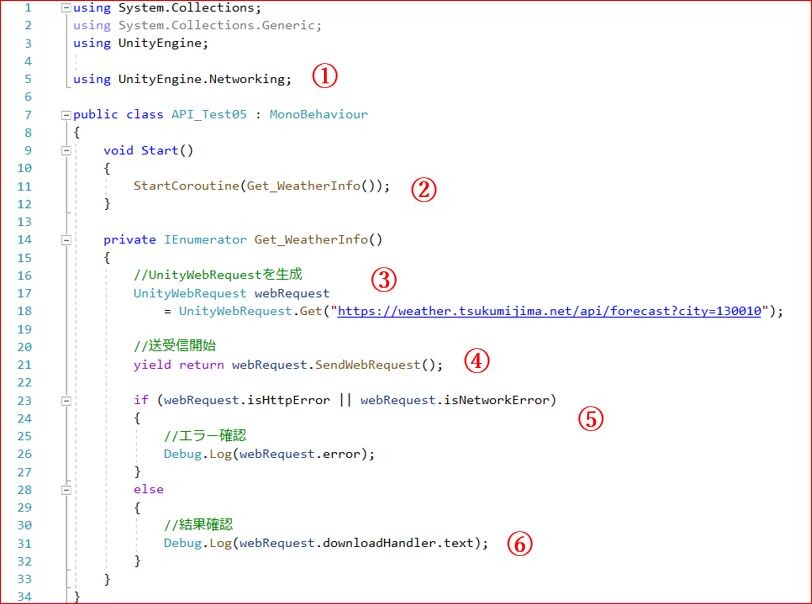 ① :まず、UnityWebRequestを使うには「using UnityEngine.Networking;」が必要です。