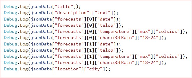 Debug.Log(jsonData["forecasts"][0]["telop"]);
