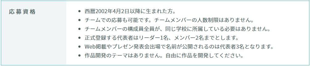 モバイルアプリが対象となります。高校生以下が参加できます。こちらもゲームに限らず多くの実用的なアプリが応募されています。ソースコードを事前に提出してソースコードの実装力と技術チャレンジも審査されます。
