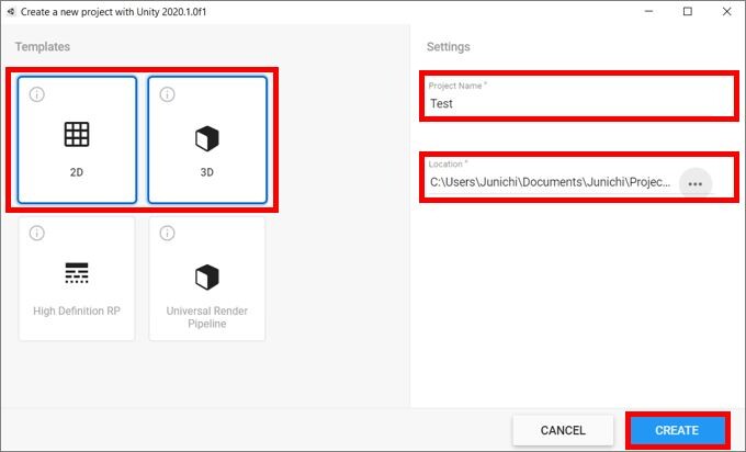テンプレート(Templates)は今から作るゲームが「2D」なのか「3D」なのかを選択します。ここでは「2D」にしておきます。最後に「CREATE」をクリック。