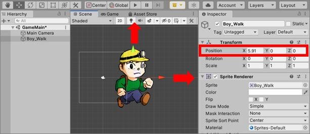 するとSceneビュー上の画像オブジェクトにX軸(赤色)Y軸(緑色)の矢印が現れます。その矢印をドラッグすると軸に沿ってオブジェクトを移動することができます。Inspectorビュー上のPosition(位置)の数字も自動的に変わります。