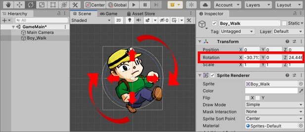 するとSceneビュー上の画像オブジェクトにX軸(赤色)Y軸(緑色)Z軸(青色)を中心とした円が現れます。その円をドラッグするとそれぞれの軸を中心にオブジェクトを回転させられます。Inspectorビュー上のRotation(回転)の数字も自動的に変わります。