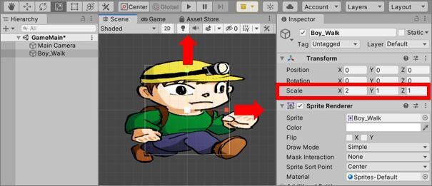 するとSceneビュー上の画像オブジェクトにX軸(赤色)Y軸(緑色)の四角矢印が現れます。その四角矢印をドラッグすると軸に沿ってオブジェクトを拡大・縮小させることができます。Inspectorビュー上のScale(大きさ)の数字も自動的に変わります。