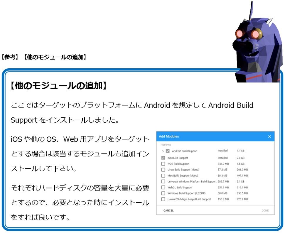 (Macを使用してAndroid用のアプリを作成する場合も上記のようになります。また、Macを用いてiPhone用のアプリを作成する場合は、「iOS Build Support」をインストールする必要があります。)