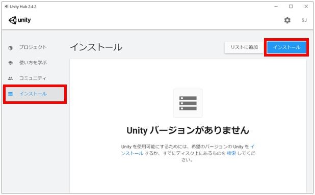 では、やっとUnityをインストールする準備ができました。左のメニュー上で「インストール」をクリックしてインストール画面を表示させます。右上の「インストール」ボタンをクリックします。