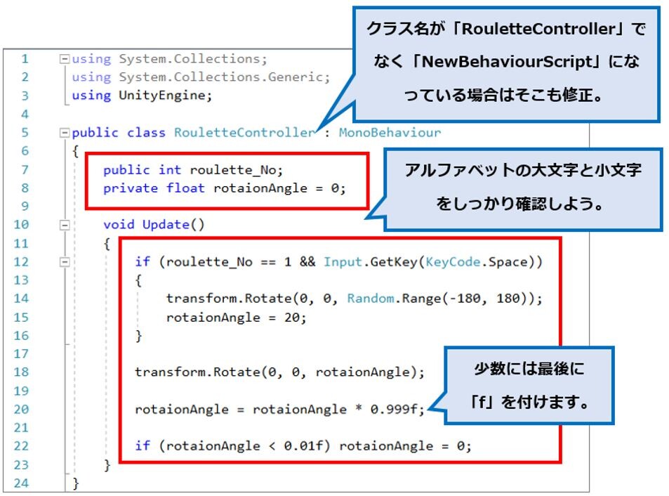 (注意)クラス名が「RouletteController」でなく「NewBehaviourScript」になっている場合は、そこも修正して下さい。