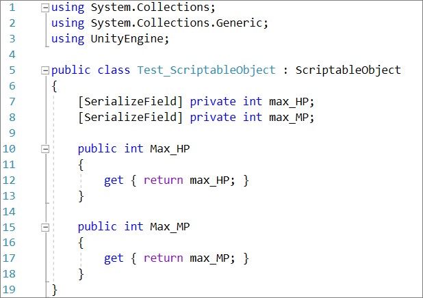 ScriptableObjectを継承したクラス内にマスターデータの変数を、Inspectorビュー上から変更可能にするために「SerializeField」か「public」で定義します。