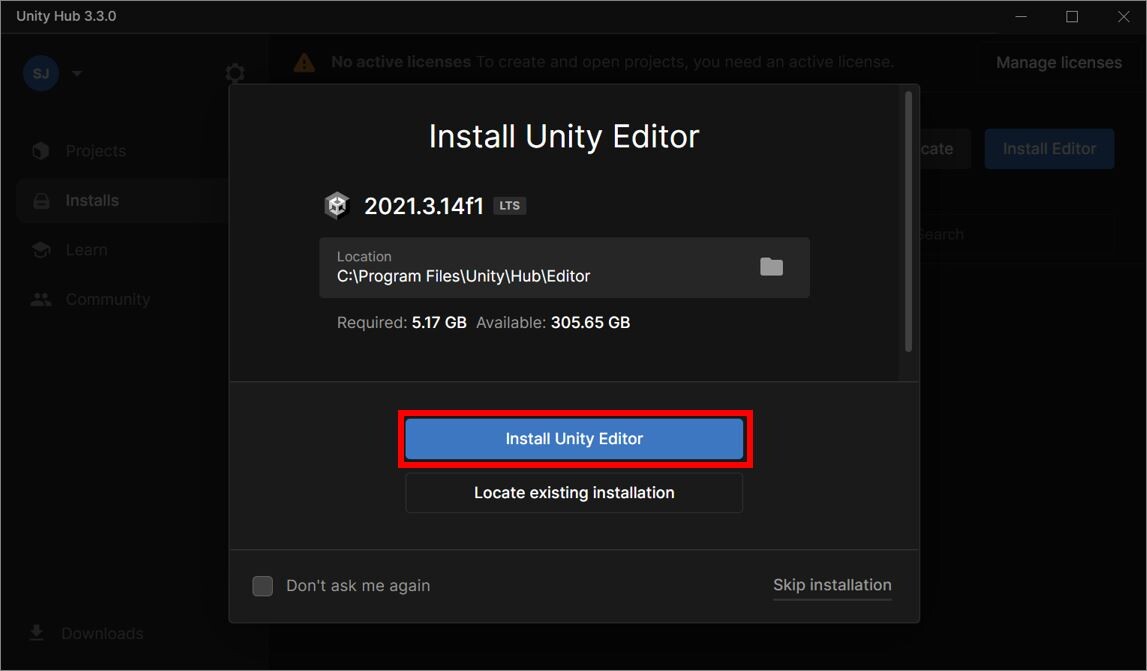 初めてUnityをインストールする場合、Unityのインストール画面が自動で表示されます。