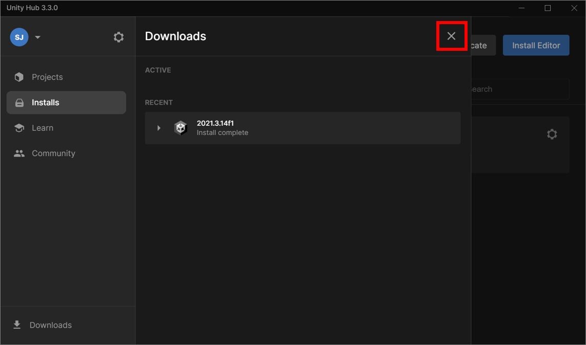 Unityのインストールが正常に終了しました。「×」クリックで Downloadsウィンドウを閉じます。