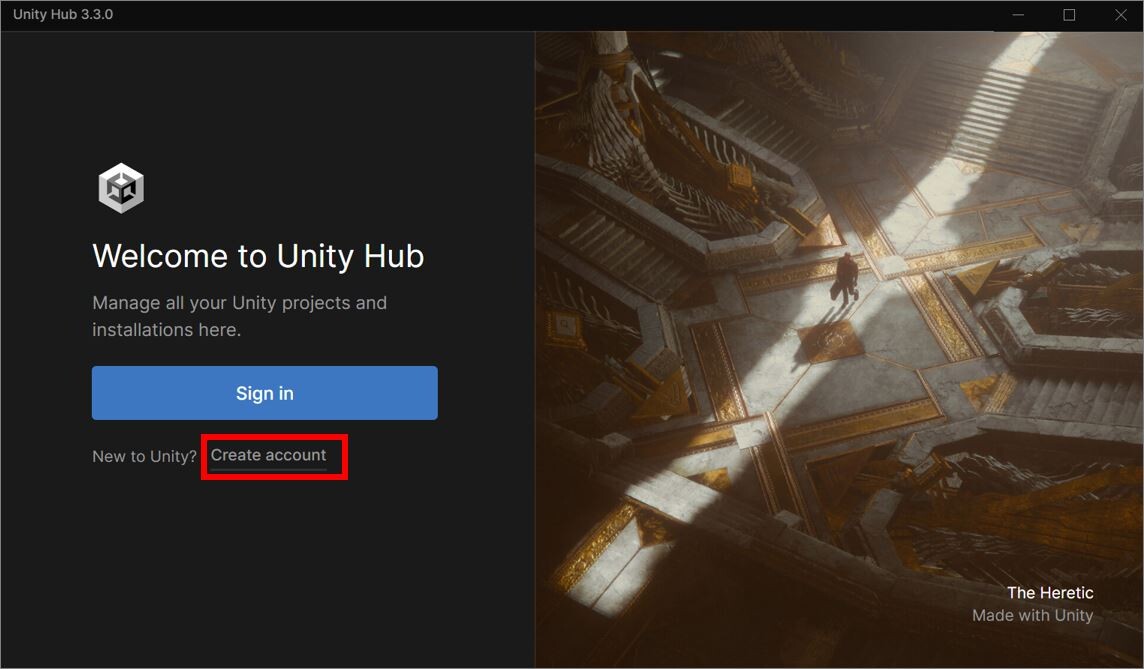 Unityを初めて使用する場合は、Unity IDの新規登録をします。「Create account」をクリックします。
