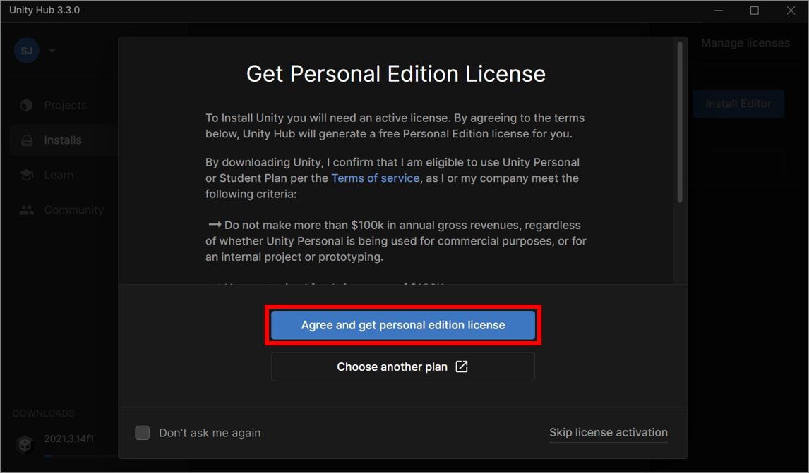 Personal Editionライセンスの確認画面が表示されますので「Agree and get personal edition license」をクリックします。