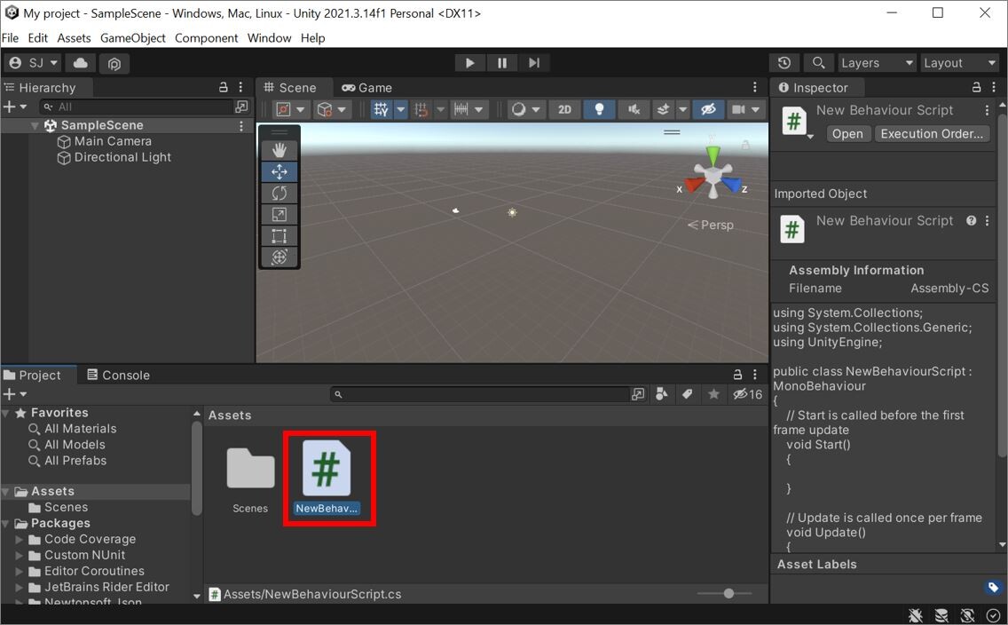 Projectビューに C#スクリプトファイルが作成されました。