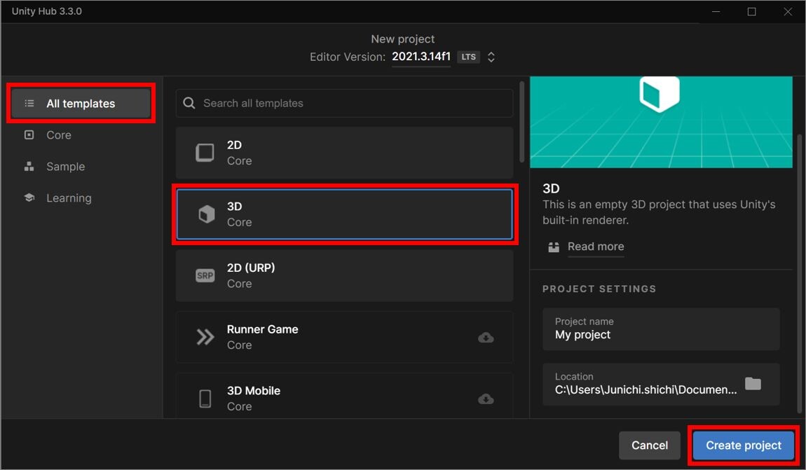 ここから Unityエディタ上の設定をするため、一度プロジェクトを作成します。
