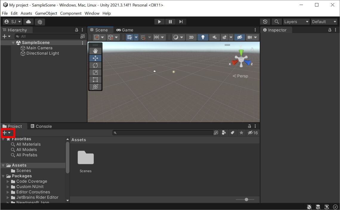 Unityエディタの Projectビューにある「+」ボタンをクリックします。