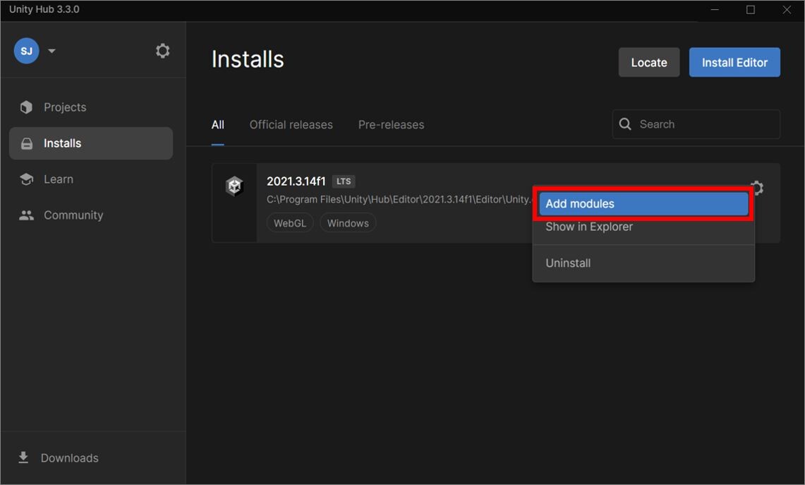 表示されたメニューから「Add modules」を選択します。