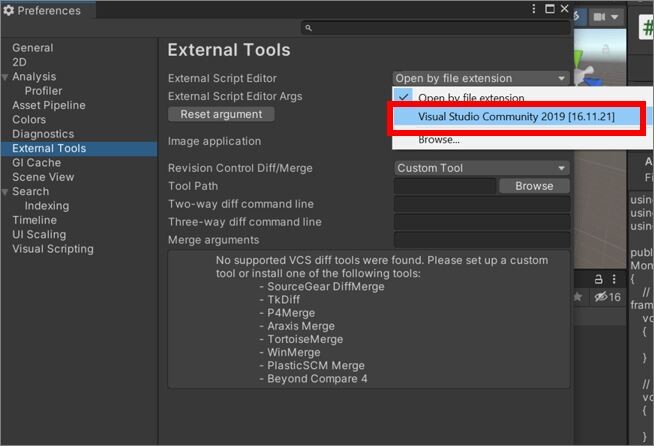 External Script Editorプルダウンから「Visual Studio Community 2019」を選択します。